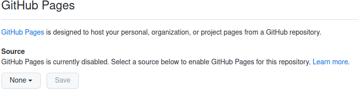 Display your repository in a web browser, and select the “settings” icon. On the settings page, click on “pages” in the left hand window. When it displays “GitHub Pages”, go down to source and select on the “None” pull down.