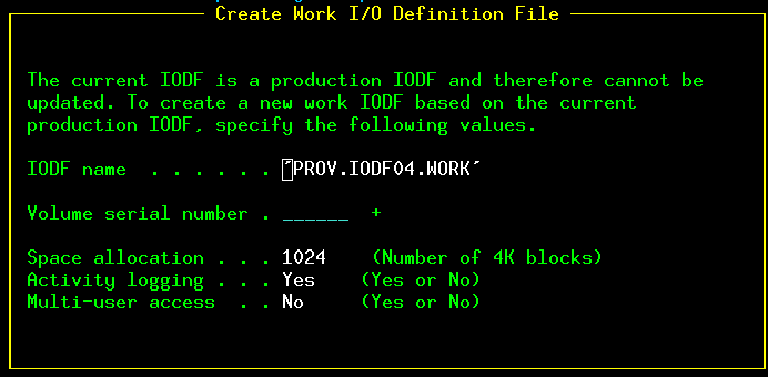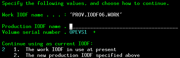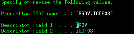 Enter a new data set name, such as PROD.IODF08, and the volume serial. (I think this is the same volume as your SYSn.IPLPARM dataset.