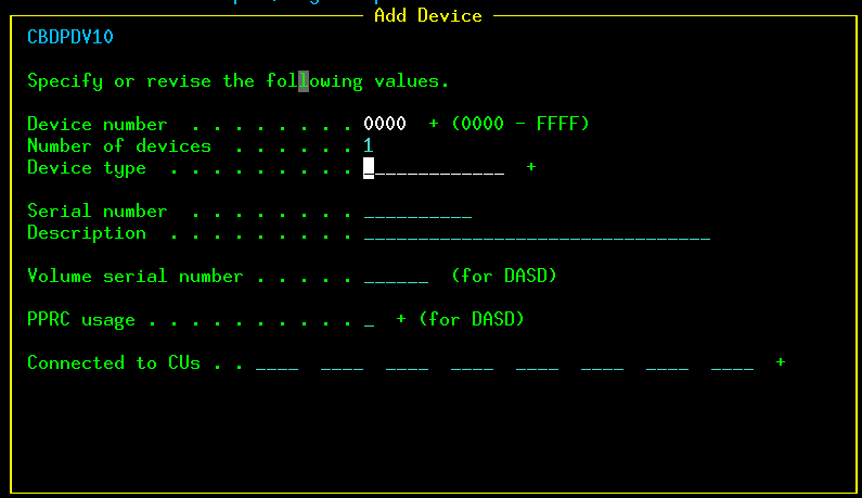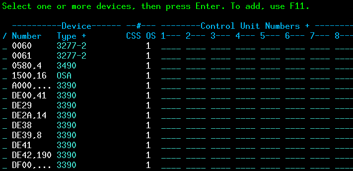 • Press PF11 to add a device (or put D in the line command for an entry to delete an entry). This may display